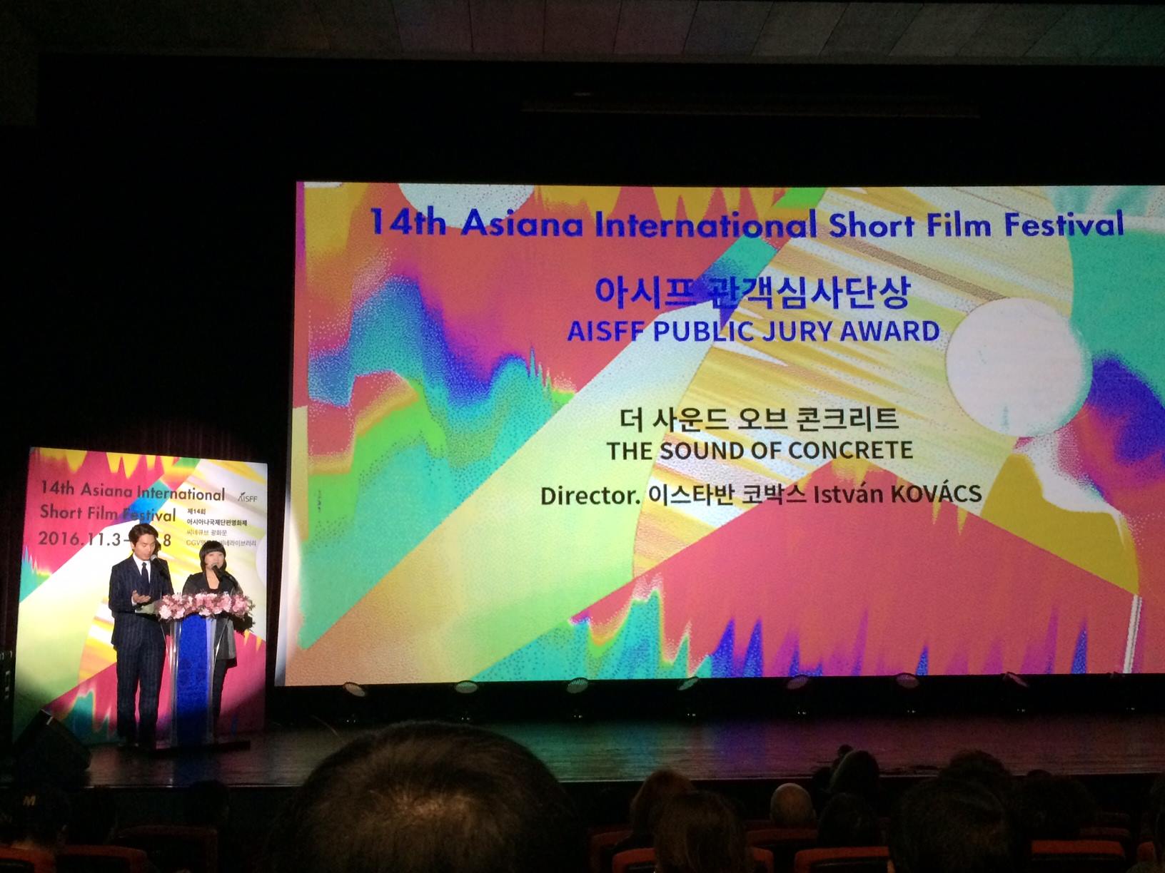 A 14. Asiana Nemzetközi Rövidfilm Fesztiválon (AISFF) két magyar film került reflektorfénybe: Deák Kristóf „Mindenki” („Sing”) című alkotását nagy sikerrel vetítették a megnyitó gálán, Kovács István: Betonzaj („The Sound of Concrete”) című alkotása pedig elnyerte a „Public Jury Award” díjat. Gratulálunk az alkotóknak!